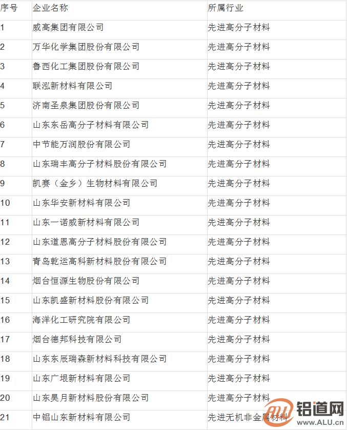据山东省工业和信息化厅,为贯彻落实全省新旧动能转换重大工程战略部署,加快推动新材料领军企业培育工程建设,根据《山东省新材料产业发展专项规划(2018-2022年)》要求,经过企业申报、各市推荐、专家评审,山东省工业和信息化厅公布2018年山东省新材料领军企业50强名单。其中,先进有色金属材料行业中有三家铝业企业上榜。
