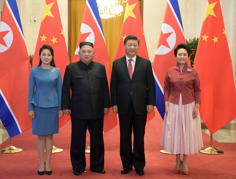1月8日,中共中央总书记、国家主席习近平同当日抵京的朝鲜劳动党委员长、国务委员会委员长金正恩举行会谈。会谈前,习近平在人民大会堂北大厅为金正恩举行欢迎仪式。这是习近平和夫人彭丽媛同金正恩和夫人李雪主合影。新华社记者 李学仁 摄