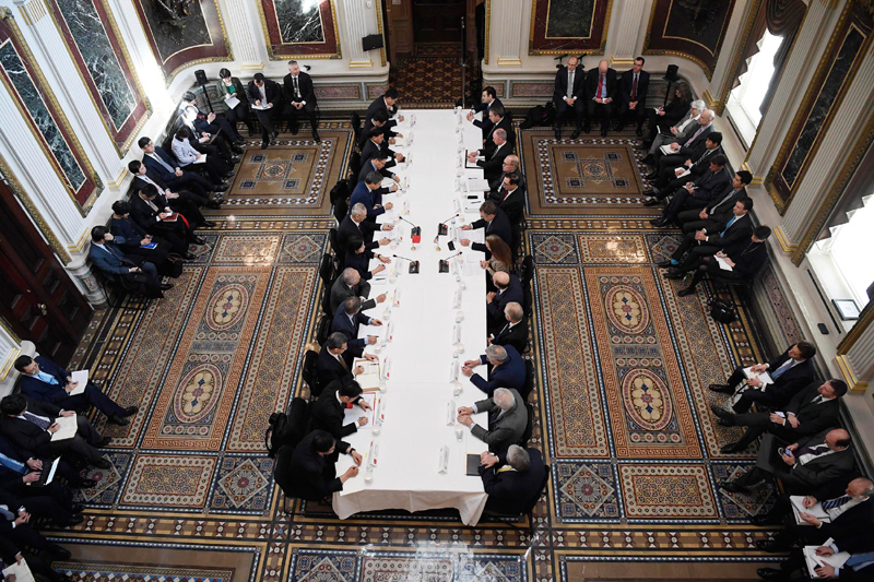 当地时间2月21日上午,习近平主席特使、中共中央政治局委员、国务院副总理、中美全面经济对话中方牵头人刘鹤与美国贸易代表莱特希泽、财政部长姆努钦,在美国白宫艾森豪威尔行政办公楼共同主持第七轮中美经贸高级别磋商开幕式。新华社记者 刘杰 摄