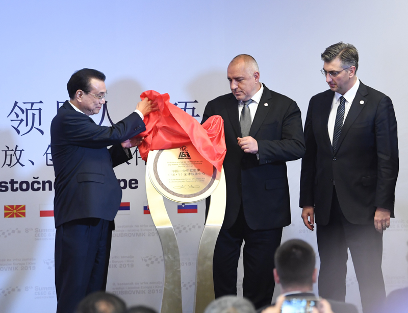 当地时间4月12日下午,国务院总理李克强在杜布罗夫尼克出席第八次中国-中东欧国家领导人会晤后,与保加利亚总理鲍里索夫、克罗地亚总理普连科维奇共同为“16+1全球伙伴中心”揭牌,宣布“16+1全球伙伴中心”正式成立。