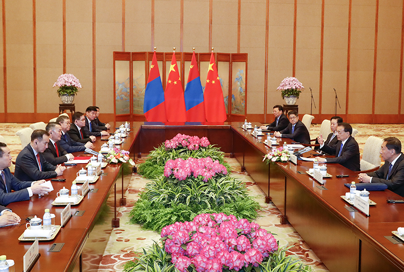 李克强表示,中蒙是山水相连的友好邻邦。今年适逢中蒙建交70周年和《中蒙友好合作关系条约》修订25周年,两国关系迎来新的发展机遇。习近平主席将同总统先生举行会谈,规划两国关系下一步发展。中方愿同蒙方加强政治互信,尊重彼此核心利益和重大关切,推动中蒙全面战略伙伴关系再上新台阶。我们愿在相互尊重、平等合作、互利互惠的基础上深化双方务实合作,将“一带一路”倡议同蒙方“发展之路”倡议对接,加快推进中蒙自贸协定和经济合作区,深化在农业、产能、人文等领域的交流合作,继续在边境运输、口岸建设等方面为蒙方提供便利。