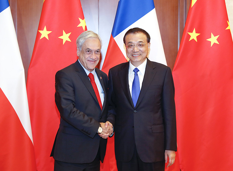 李克强表示,智利是第一个同新中国建交的南美国家,明年将迎来两国建交50周年。习近平主席同总统先生举行了富有成果的会谈,为中智全面战略伙伴关系深入发展注入新动力。去年,在全球贸易增长乏力背景下,中智贸易逆势增长,显示出两国合作的巨大潜力。希望双方面向未来,以深入共建“一带一路”为契机,加强发展战略对接,建设好升级版中智自贸区,拓展在交通基础设施、电力、农业、矿业、创新等领域的务实合作。中方愿进口更多智利优质产品,发挥电子商务等数字经济平台作用,并利用中智自贸区扩大同拉美其他国家的经贸合作,不断推动中拉整体关系与合作向前发展。