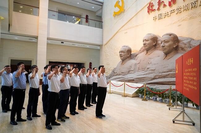 一入馆,湖南省自然资源厅党组书记、厅长王一鸥便带领全体厅领导和厅机关全体党员在“潇湘魂”毛泽东、刘少奇、任弼时大型伟人半身雕塑前整齐列队,举起右拳,面向鲜红的党旗高声宣读入党誓词。