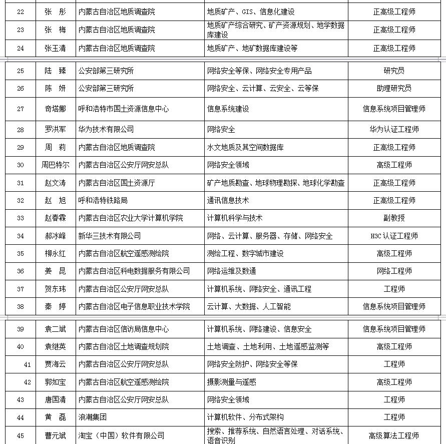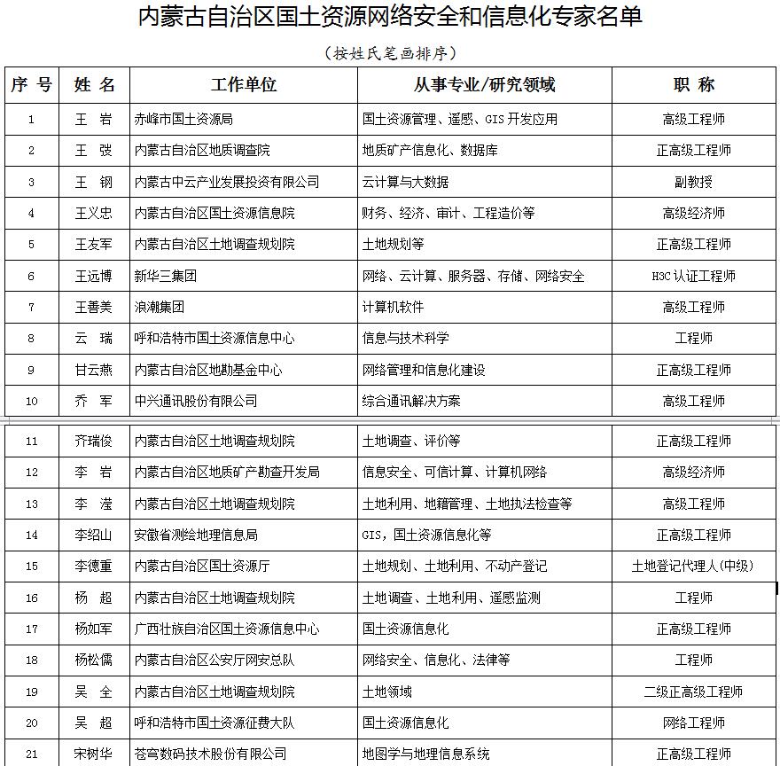 2018年7月5日至13日,我厅对王岩等49名拟入选为内蒙古自治区国土资源网络安全和信息化专家库的专家进行了公示,公示期间,未收到对拟入选为专家库专家人选的疑义或异议,现对本次入选为内蒙古自治区国土资源网络安全和信息化专家库的专家名单予以公告。