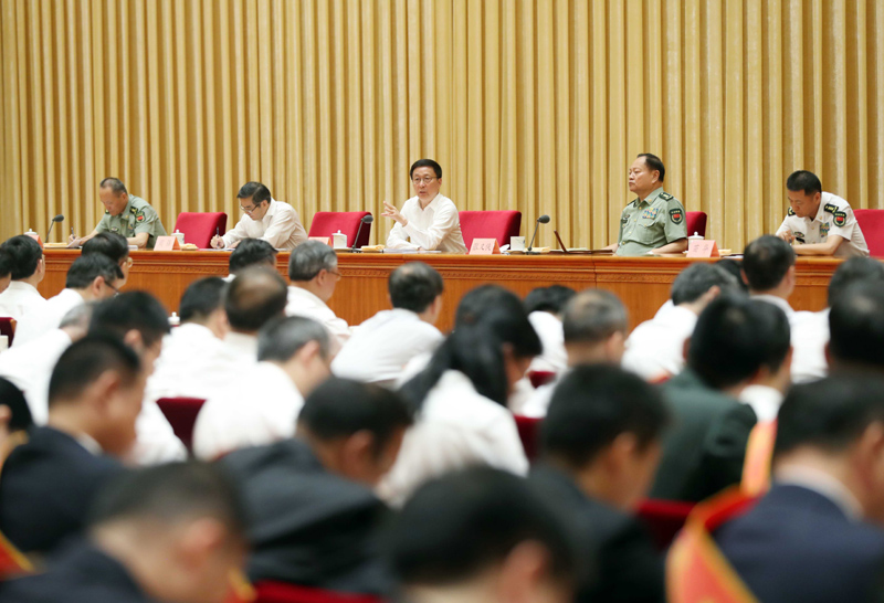 7月12日,中共中央政治局常委、国务院副总理韩正在北京出席全面停止军队有偿服务工作总结表彰大会并讲话。新华社记者 刘卫兵 摄