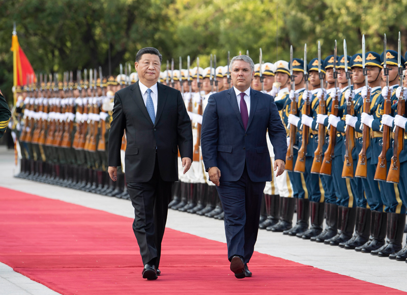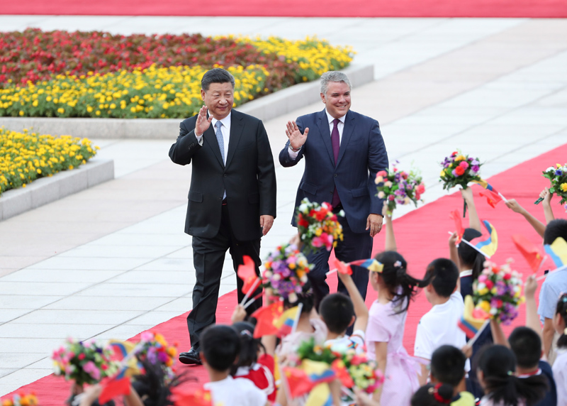 7月31日,国家主席习近平在北京人民大会堂同哥伦比亚总统杜克举行会谈。这是会谈前,习近平在人民大会堂东门外广场为杜克举行欢迎仪式。新华社记者 李学仁 摄