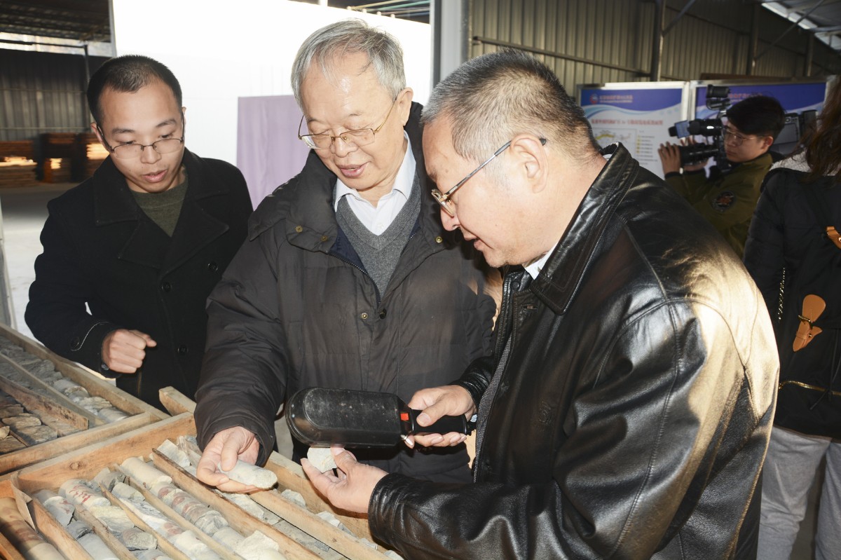 姚振兴院士(中)察看朱溪项目部白钨矿岩芯