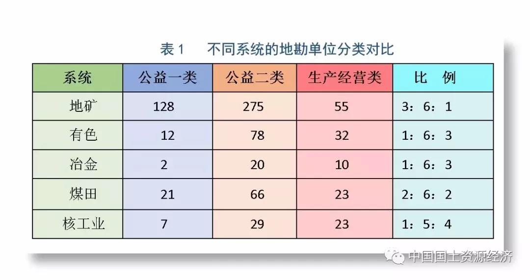通过对地矿(地勘、地质)、有色、冶金、煤田、核工业系统对比分别梳理,公益一类、公益二类、生产经营类的基本比例见表1。