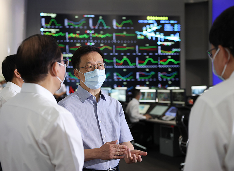 8月17日,中共中央政治局常委、国务院副总理韩正到国家电网有限公司调研并主持召开座谈会。这是座谈会前,韩正来到国家电力调度控制中心,详细了解电力供应保障、电网调度运行等情况。新华社记者 丁林 摄