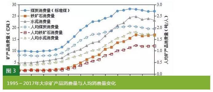 1995年~2017年,我国矿产资源消费总量经历了稳定增长、快速增长与增速显著放缓的变化。消费量在10亿吨级的大宗矿产品消费量可能达峰值并出现微降,多数有色金属与贵金属消费量增速放缓、高位趋稳,油气矿产与消费量在万吨级及以下的战略新兴矿产消费量继续保持增长的趋势。2018年上半年,全国继续深入推进供给侧结构性改革,一季度第三产业增加值同比增长7.5%,增速比第二产业快1.2个百分点,占国内生产总值的比重为56.6%,比第二产业高17.6个百分点,产业结构不断优化,发展向中高端迈进。由此可以判断,随着产业结构升级,经济发展对资源依赖的刚性总体上将有所弱化。