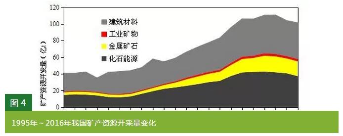 2012年以来,矿产资源开采总量增速显著放缓,于2014年达到峰值110.82亿吨,到2016年降至101.47亿吨,比峰值降低8.4%。2017年统计数据尚没有全部出来。2017年煤炭产量34.45亿吨,同比增长3.2%,比峰值低13.3%;铁矿石产量12.29亿吨,同比下降4.0%,比峰值低18.8%;水泥产量23.4亿吨,同比下降3.1%,比峰值低6.4%;十种有色金属产量5501.0万吨,同比增长2.9%,增速下滑0.1%。2018年1月~5月,原煤产量同比增长4.0%,铁矿石产量同比下降0.1%;水泥产量同比下降0.8%;十种有色金属产量同比增长3.2%。这些数据表明,2017年~2018年上半年矿产资源开采总量延续了前几年的高位波动趋势。