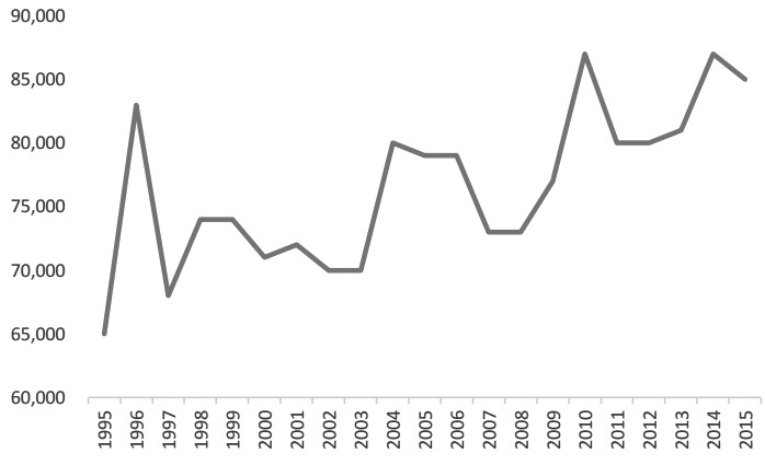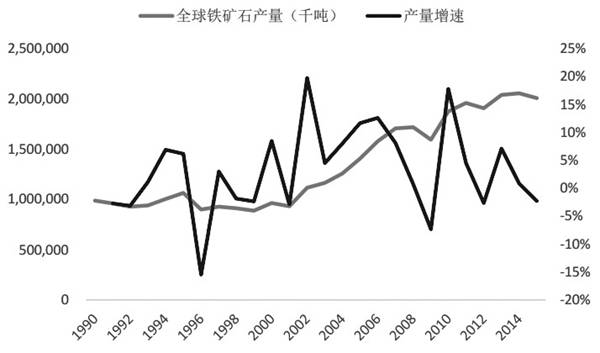 2000年以来,全球铁矿石产量整体呈上升趋势,2003—2007年为快速增长阶段,年均增长率超过10%;2007—2013年增速放缓,个别年份受铁矿石价格波动影响,产量出现下滑;2013年以后,全球铁矿石产量基本保持稳定,截至2015年年末,全球铁矿石产量为20.06亿吨。