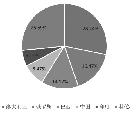 我国是世界头号钢铁生产大国,国内铁矿石由于产量、品位等原因,不能满足钢铁生产需求,因此需要大量进口铁矿石。2010年,我国铁矿石的进口依存度约63.4%,至2015年这一比例上升至88.5%。2017年,我国进口的铁矿石,62.30%来自澳大利亚、21.35%来自巴西、2.34%来自印度、4.20%来自南非。