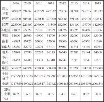 表为2008—2015年全球前10大铁矿石生产国产量(单位:千吨)