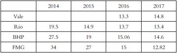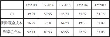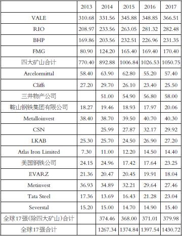 表为2013—2017年全球前17大矿业公司铁矿石年度产量(单位:百万吨)